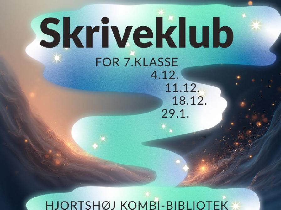 Vi tilbyder en skriveklub med 3 gange, hvor vi deler tekster med hinanden, får skriveundervisning og giver hinanden feedback. Vi hygger os også, og biblioteket sørger for lidt snacks. Du kan få inspiration og hjælp til en skrivekonkurrence, som vi også afholder i januar - eller du kan bare få inspiration og fællesskab omkring det at skrive. Den ene af gangene får vi undervisning af forfatter Mads Mygind.