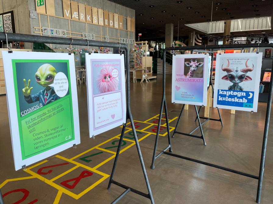 Hovedbiblioteket5. d fra Skødstrup skole har skabt 11 meget forskellige aliens. Eleverne har arbejdet med demokrati-øvelser, mærkesager og Ai, og har i programmet Collagemaker skabt de flotte valgplakater i udstillingen. Kom forbi udstillingen og find din favorit til verdens hersker.