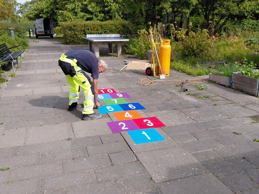 JI Sport har monteret vores hoppeperson på fliserne i bibliotekshaven. Den er SÅ fin og kan ses direkte fra bibliotekets foyer. Senere på året laver vi hinkestensworkshop – en dejlig vinteraktivitet.