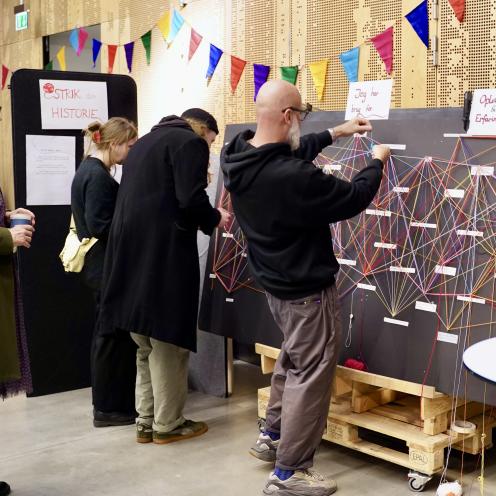 Deltagere i gang med fællesværket Som set, som så – så sammen, skabt i samarbejde med illustrator Katrine Louise Jakobsen